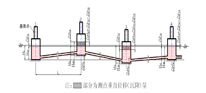 假設(shè)被測(cè)物體測(cè)點(diǎn)1作為基準(zhǔn)點(diǎn),測(cè)點(diǎn)2的地基下沉,測(cè)點(diǎn)3的地基上升,測(cè)點(diǎn)4的地基不變等等,當(dāng)系統(tǒng)內(nèi)液面達(dá)到平衡靜止后形成新的水準(zhǔn)面▽i0,則各測(cè)點(diǎn)連通容器內(nèi)的新液位值分別為:H1、H2、H3、H4,各測(cè)點(diǎn)液位變化量分別計(jì)算為:△h1=H1-H10、△h2=H2-H20、△h3=H3-H30、△h4=H4-H40,當(dāng)選定測(cè)點(diǎn)1為基準(zhǔn)點(diǎn),則其它各測(cè)點(diǎn)相對(duì)基準(zhǔn)點(diǎn)的垂直位移(沉降量)為:△H2=△h1-△h2、△H3=△h1-△h3、△H4=△h1-△h4,如下圖: