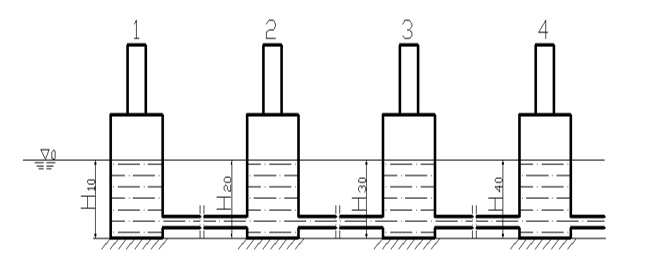 靜力水準(zhǔn)系統(tǒng)又稱(chēng)連通管水準(zhǔn)儀,系統(tǒng)至少由兩個(gè)觀測(cè)點(diǎn)組成,每個(gè)觀測(cè)點(diǎn)安裝一套靜力水準(zhǔn)儀。靜力水準(zhǔn)儀的貯液容器相互用通液管完全連通,貯液容器內(nèi)注入惰性液體,當(dāng)液體液面完全靜止后系統(tǒng)中所有連通容器內(nèi)的液面應(yīng)同在一個(gè)大地水準(zhǔn)面上,此時(shí)每一容器的液位由傳感器測(cè)出,即初始液位值分別為:H10、H20、H30、H40、如下圖: